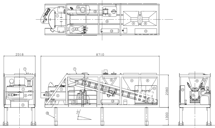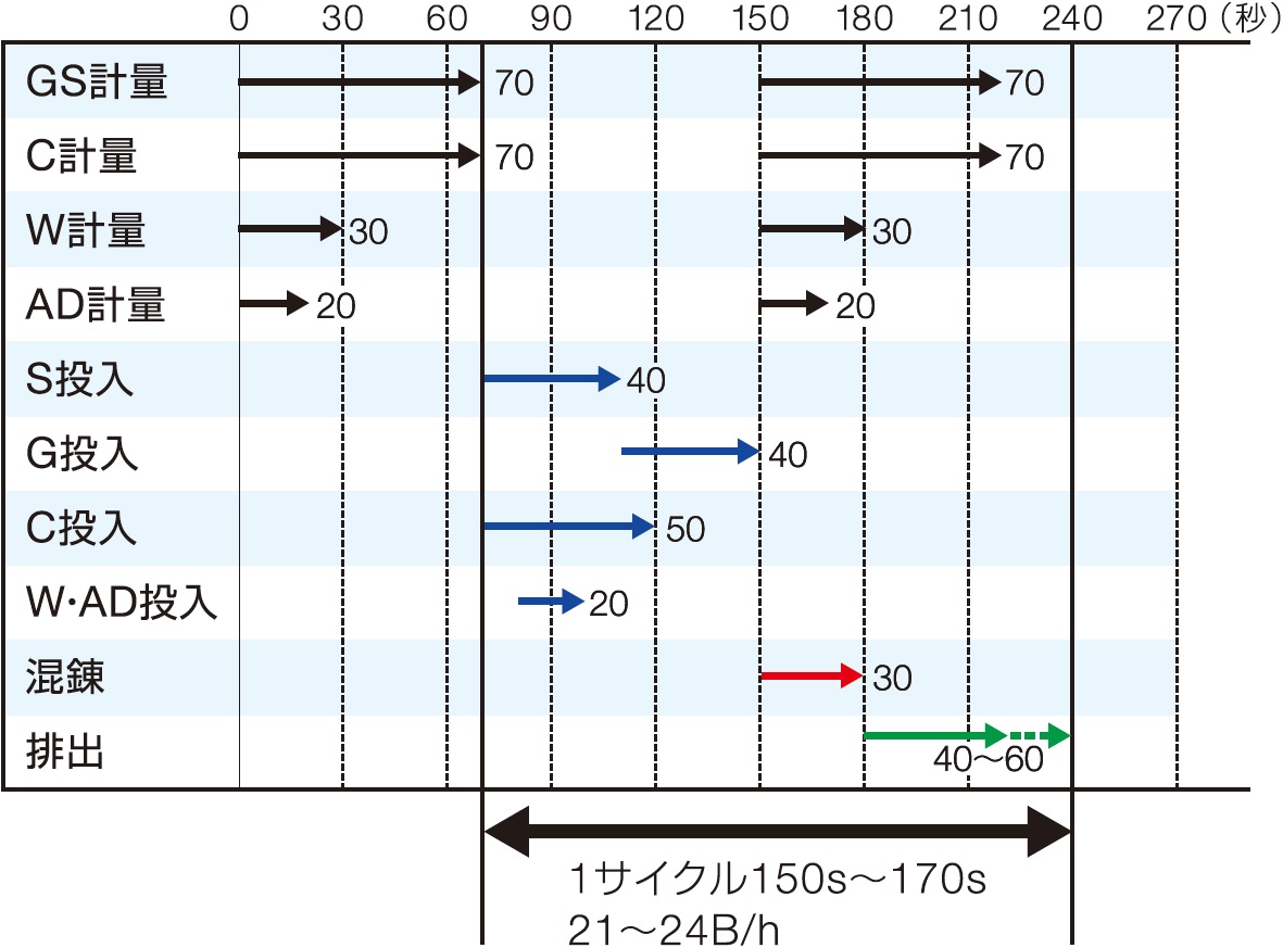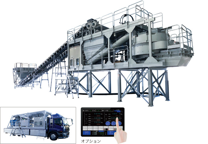 特徴 場所を選ばず活躍できる、モバイル型バッチャープラント 大型トラックに積載でき、災害時の復興や狭い工事現場などに幅広く使用できる、コンパクトで安定品質のモバイル型バッチャープラント。 カタログダウンロード(PDF) コンパクト設計 災害時の復興プラント、工事用現場プラントなどで幅広く使用できるコンパクト設計。 かんたん輸送 大型トラックに積載でき、さまざまな現場への移送が可能です。 製品品質の安定 バッチ式を採用することでコンクリートの品質が安定。 かんたん操作 タッチパネルタイプの操作盤のため、直感的でスムーズな操作が可能。さらにタブレット端末でも操作ができ、遠隔での操作も可能です。 仕様 本体ユニット 名称 名称 ① 投入装置 ⑨ 骨材投入コンベヤ ② ミキサ ⑩ セメント投入スクリュー ③ 排出シュート ⑪ 動力操作盤 ④ 砂利計量装置 ⑫ コンプレッサ ⑤ 砂計量装置 ⑬ 高圧洗浄ポンプ ⑥ セメント計量装置 ⑭ 水タンク ⑦ 水計量装置 ⑮ 本体脚 ⑧ AD計量装置 配置例 下記表内※印は、参考値を示します。処理する材料、品質等により変わります。 名称 名称 ① 本体ユニット ④ 受付ホッパ※ ② セメント計量ユニット※ ⑤ セメントタンク※ ③ 骨材計量コンベヤ※ 標準仕様 型式 ミキサ 能力※排出機構により変動 コンプレッサ 高圧洗浄ポンプ 排出シュート 重量 ONZEMIX-T50 0.5m3タービンミキサ18.5kW 0.5m3/B×21B/h=10.5m3/h 3.7kW レシプロコンプレッサエアドライヤ付 1.5kW t6SSライナー仕様 10,700kg ONZEMIX-T75 0.75m3タービンミキサ37kW 0.75m3/B×21B/h=15.75m3/h 12,400kg 型式 計量設備 貯蔵設備 材料名(最大秤量×最小目盛) 材料名 骨材 水 セメント 混和剤 水 混和剤 S G W C AD W AD ONZEMIX-T50 800kg×1kg 800kg×1kg 150kg×0.2kg 250kg×0.2kg 15kg×0.01kg 300L 100L ONZEMIX-T75 1,000kg×1kg 200kg×0.2kg 500kg×0.2kg 備考 計量装置 BC計量600巾×90T/H ロータリバルブ SC計量200A×20T/H ロータリバルブ ポリタンク 薬液タンク ロードセル計量簡易静荷重フック付 ロードセル計量簡易静荷重フック付計量ポンプ付 ロードセル計量簡易静荷重フック付バイブレータ付 ロードセル計量計量ポンプ付 ボールタップ付練水・洗浄水兼用 1種 オプション仕様 集塵機 0.75kW 手動脱塵 セメント計量ユニット セメント計量バタ弁□300×Φ150 1式 骨材ホッパ 3m3 手動ゲートバイブレータ付(Sのみ) 骨材計量コンベヤ 2.2kW 400巾×40T/H セメントタンク 30T移動式 タイムチャート 紹介動画 関連製品 ミキサ DASH-Hyper C ダブルスパイラルフローミキサ(DSF) 一軸フリーモードミキサ 遊星タービンミキサ / タービンミキサ 傾胴ミキサ 食品用サニタリーミキサ くいっかー ECBミキサ(造粒ミキサ) GEO-TOM連続式ニ軸ミキサ モバイル型プラント(ONZEMIX) 自動計量式ミキシングユニットNeo 自走式土質改良機 MobixEco お問い合わせ内容について 当社の個人情報保護方針に同意の上、お問合せください。 必須 同意する お問い合わせの種類をお選びください。 必須 ご選択ください カタログ・資料請求 価格・仕様など説明希望 その他 お問い合わせ内容必須 ■お客様情報 メールアドレス 必須 会社名 必須 部署名 役職名 お名前(姓) 必須 お名前(名) 必須 〒 必須住所自動代入 都道府県 必須 市区郡 必須 住所(市区郡以降) 必須 電話番号 必須 FAX番号 お客様情報をブラウザに保存する 確認画面をスキップする 入力内容を確認
