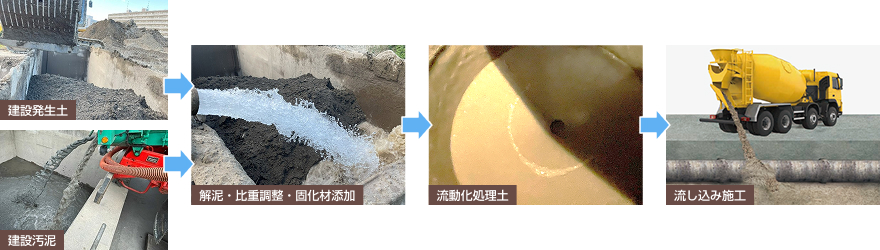 流動性と自硬性により締固めが不要で、狭い空間や複雑な形状にも隙間なく充填できる土木資材です。建設発生土や汚泥の再利用が可能です。