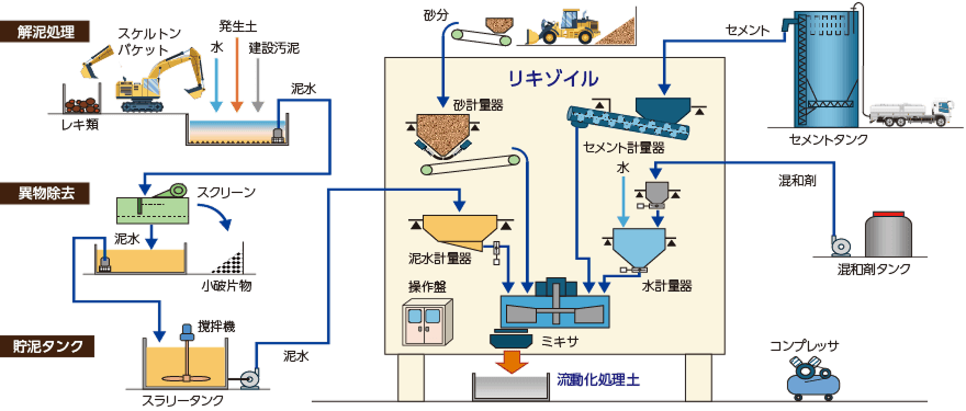 建設発生土や建設汚泥の再利用ができ、狭い空間や複雑な形状にも隙間なく流し込みができる土木資材「流動化処理土」の製造設備を、移動・設置がしやすいユニット化にしました。