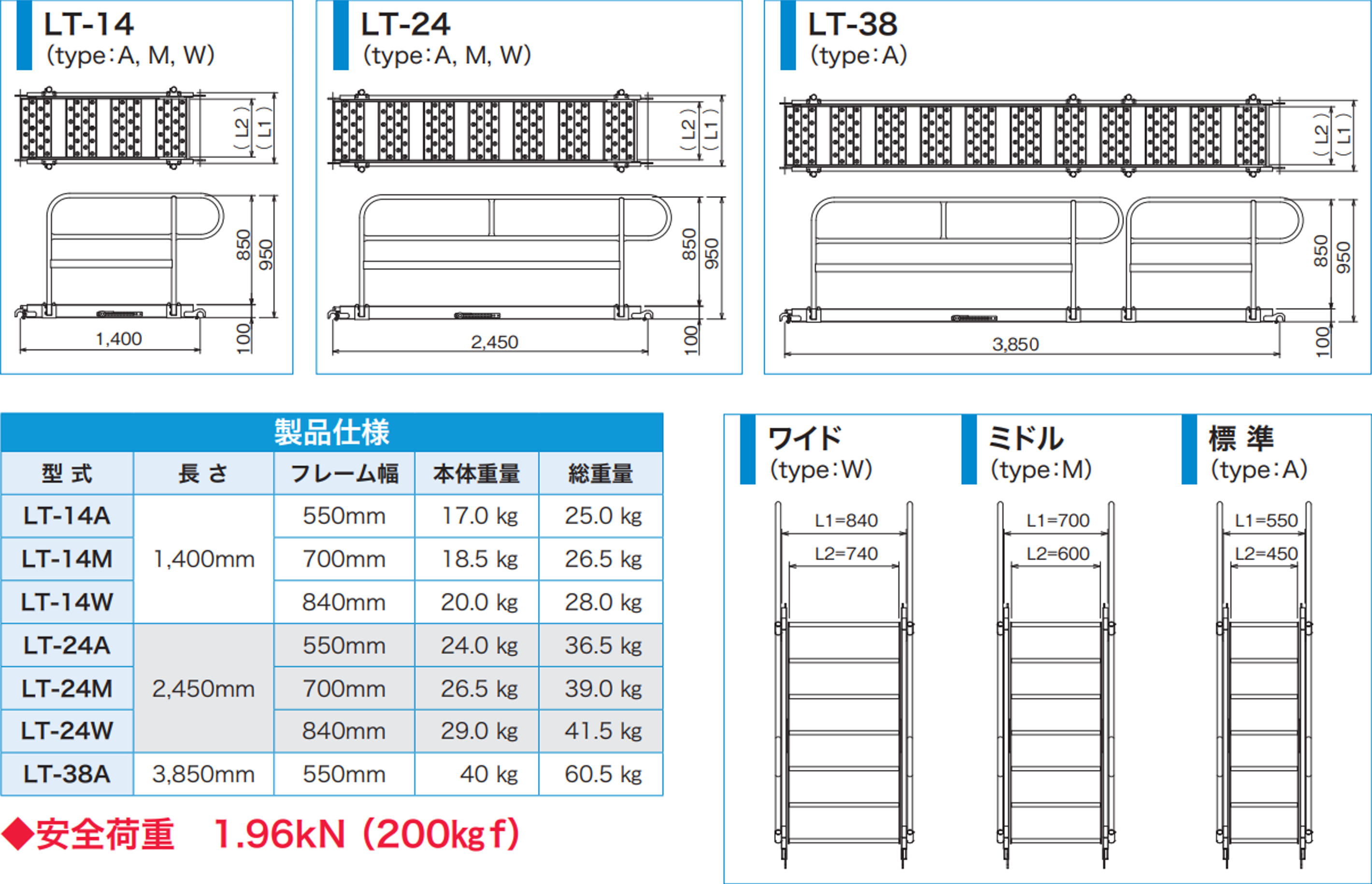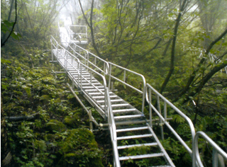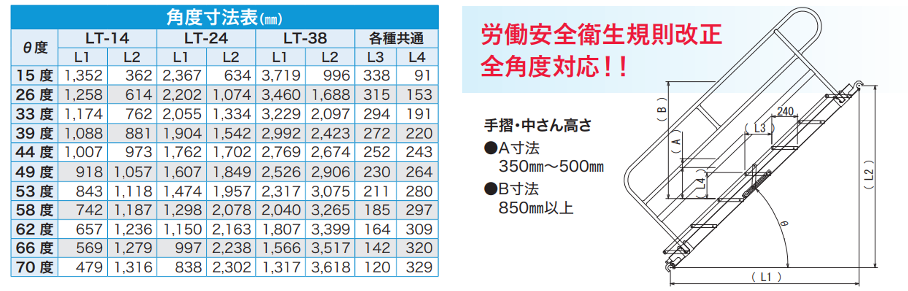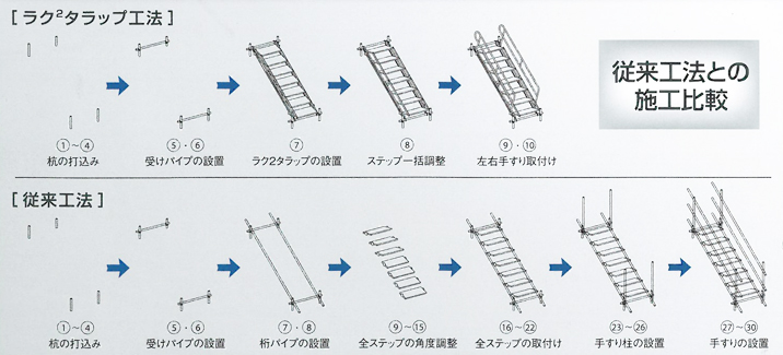 単管パイプと自在ステップで組み立てる従来方法の仮設階段に 代わる安全で軽量な傾斜自在階段です。各種法面における点検階段や避難通路としても活用されています。 従来の通路設置作業に対して、高い安全性と大幅な作業効率向上を自社独自で追求し、開発された傾斜自在昇降階段ユニットで、法面・斜面の強い味方です。平成24年度から5年連続NETIS認定第1位の記録を獲得しました。日工グループでは、斜面や法面などの現場ニーズを元にし、独自のノウハウと経験を活かした安全で便利な仮設機材の設計開発・製造・レンタルを行って状況に応じた柔軟な足場設計から安全管理まで、建築現場をトータルでサポートいたします。 特徴 ユニット化による高い効率 アルミ合金製で出来ているため、軽く昇降階段の本体つかみ金具を単管パイプや受け材等に掛け、ノブハンドルでステップ角度を一括調整して昇降階段設置完了します。15度~70度まで11段階の昇降階段の調整ができ、あらゆる法面・斜面に対応可能です。 安全性の確保 昇降階段の本体つかみ金具には、パイプの外れを防ぐため、はずれ止め防止機能があります。また、墜落防止対策として労働安全衛生規則改正に対応した昇降階段の手すりを採用しております。 豊富なサイズ設定 サイズ設定も長さ1,400㎜/2,450㎜/3,850㎜(標準TYPE Aのみ)に加えてステップ幅もW450㎜/W600㎜/W740㎜と豊富なライナップを取り揃えており、どのような法面・斜面に合わせた昇降階段としてレンタルしていただけます。 充実したオプション機材 急角度な現場時での安全確保には、昇降階段の手すりアタッチメントをご用意しています。長い法面通路には斜面ノリダーを併用し、踊場を設ける事で高所現場通路での安全を確保します。また、手すりは、労働安全衛生規則の改正に対応した仕様となっています。 NETIS評価製品 ラクラクタラップは国土交通省新技術登録システム(NETIS)にて、平成24~28年度の5年連続で活用ランキング1位となり、平成26年度推奨技術に選出された製品です。(NETIS 旧登録 No.KT-010099VE) 比較 各種機能 外れ止め機能を有するつかみ金具を使用(φ42.7/φ48.6兼用) ステップには滑り止め加工が施されており、昇降時の安全性を確保。 ダイヤルノブ式の角度調整機能を使用(指詰め防止機能付) 全ステップがフレーム内に収納され積載・保管 がスッキリと行えます。 全ステップが連動され一括して角度調整が 行えます。 仕様 昇降階段の製品仕様 昇降階段の角度寸法 労働安全衛生規則改正【全角度対応】 手摺・中さん高さ A寸法:350mm~500mm / B寸法:850mm以上 製品情報(ラクラクタラップ) お問い合わせ内容について お問い合わせ内容について 当社の個人情報保護方針に同意の上、お問合せください。 必須 同意する お問い合わせの種類をお選びください。 必須 ご選択ください カタログ・資料請求 価格・仕様など説明希望 その他 お問い合わせ内容必須 ■お客様情報 メールアドレス 必須 会社名 必須 部署名 役職名 お名前(姓) 必須 お名前(名) 必須 〒 必須住所自動代入 都道府県 必須 市区郡 必須 住所(市区郡以降) 必須 電話番号 必須 FAX番号 お客様情報をブラウザに保存する 確認画面をスキップする 入力内容を確認