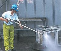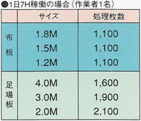 「仮設足場機材センターの経営効率」と「足場作業環境の改善」を目指してユーザー発想から開発された仮設足場洗浄装置です。アルミ製品の仮設足場や昇降階段などに抜群の洗浄威力を発揮します。従来のケレン装置では限界のあった、コンクリートや足場の塗料などの汚れを簡単に落とすことや、アルミ製足場機材もワークを傷つけることなく洗浄できます。作業時の粉塵も全く発生せず、足場作業環境を改善します。さらに自動搬送積載システム、ロータリーハンドガンなどを組合せることにより、従来の仮設足場水圧洗浄機にくらべ画期的な省力化が図れます。 ラインナップ 足場板 専用洗浄装置 N-SEC-J 搬送コンベア速度と調整で、最適足場洗浄 8穴ノズル法式による強力で広範囲洗浄 足場ワークに合わせて回転/高さ調整が可能 速度3.0〜12.0m/min 洗浄圧力150Mpa 消費水量24L/min 鋼製布板1200枚 / 8h 足場板1800枚 / 8h 足場板 専用洗浄装置 N-SEC-WJ 移動式ブロックノズルによる高い洗浄力 支柱回転式による洗浄むらの解消 速度5.0〜14.7m/min 洗浄圧力150Mpa 消費水量24L/min 鋼製布板600枚 / 8h 足場板800枚 / 8h 楽落ウォッシャーの特徴 抜群の洗浄力 従来の仮設足場水圧洗浄機では落とせなかった酷い汚れの足場のコンクリートや塗料等もワークを傷めることなくラクラク落とします。粉塵の発生も全くありません。 約2倍の処理能力 長尺足場板(アルミ、鋼製)を2枚ずつ同時に洗浄する為2倍の処理能力が得られ低コストランニング化を実現。 ロータリーノズル方式 広幅ケレンで効率運転が可能となりノズルの角度調整でワークの側面もケレンします ハンドガンによる洗浄 ロータリーハンドガンを使えば枠組足場の建枠や昇降階段、仮設通路等どんなに汚れた仮設機材等でも簡単にケレンできます。 メンテナンスが簡単 ロータリーノズル部、ケレン滓集積ボックス部は開閉式なので、メンテナンスも清掃も簡単に行うことができます。 楽落ウォッシャーの流れ 足場、仮設通路などの搬入 足場、仮設通路などの洗浄 足場、仮設通路などの積載 足場、仮設通路などの搬出 楽落ウォッシャーの仕様 洗浄対象ワーク 幅 長さ 高さ 布板 500mm 2000mm 55mm 足場板 240mm 4000mm 40mm 安全鋼板 555mm 4000mm 25mm 仕様 速度 1.0~10m/min 圧力 150Mpa(1500kgf/cm2) 水量 27L/min 電力 90kW 3相 200V 容量 900NL/min 基礎、電源はご支給願います。 半自動簡易式装置のご相談も受けています。 楽落ウォッシャー Junior ガンの仕様 型式 RGA15010 最高使用圧力 150Mpa(1500kgf/cm2) 最高使用流量 10L/min 最大回転数 1000rpm 駆動用エア 圧力 0.6Mpa(6kgf/cm2) エア消費量 350ML/min 冷却水 供給圧力0.01-0.1Mpa,1-3L/min 重量 7.0kg 高圧ポンプの仕様 型式 FO-30JH 吐出圧力 150Mpa(1500kgf/cm2) 吐出流量 9L/min 動力 AC 200V 22kW 全閉外扇屋内形 製品情報(楽落ウォッシャー) お問い合わせ内容について お問い合わせ内容について 当社の個人情報保護方針に同意の上、お問合せください。 必須 同意する お問い合わせの種類をお選びください。 必須 ご選択ください カタログ・資料請求 価格・仕様など説明希望 その他 お問い合わせ内容必須 ■お客様情報 メールアドレス 必須 会社名 必須 部署名 役職名 お名前(姓) 必須 お名前(名) 必須 〒 必須住所自動代入 都道府県 必須 市区郡 必須 住所(市区郡以降) 必須 電話番号 必須 FAX番号 お客様情報をブラウザに保存する 確認画面をスキップする 入力内容を確認