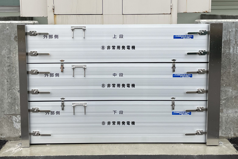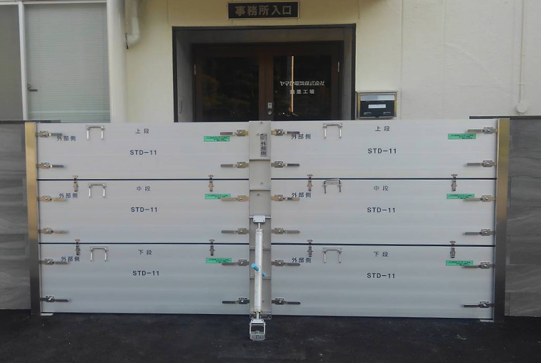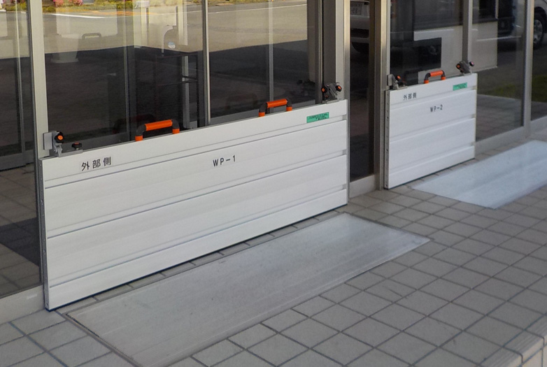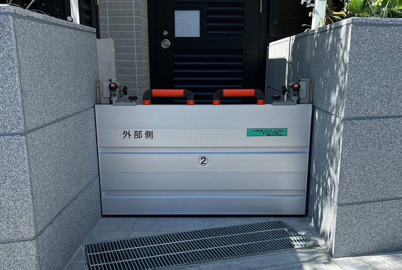 脱着式防水板ハンドルタイプ 特徴 自在な納まりであらゆる開口部に対応 設計範囲 幅:W=700mm~分割により無制限 防水高:H=200mm~1500mm(@50mm) 材質 パネル:アルミ型材 レール:ステンレス 浸水防止性能 ws-3〜6相当(2等級〜5等級) ※保証値ではございません。 導入事例 製品情報(脱着式防水板ハンドルタイプ) 脱着式防水板フリータイプ 特徴 ドア枠等に工事不要で取付可能 設計範囲 幅:W=700mm~分割により無制限 防水高:H=200mm~1000mm(@100mm) 材質 パネル:アルミ型材 浸水防止性能 ws-4相当(3等級) ※保証値ではございません。 導入事例 製品情報(脱着式防水板フリータイプ) 防水板スイングタイプ 特徴 扉の開閉操作で簡単設置 設計範囲 お問い合わせください。 材質 パネル:ステンレス・アルミ レール:ステンレス 浸水防止性能 ws-3〜6相当(2等級〜5等級) ※保証値ではございません。 導入事例 製品情報(防水板スイングタイプ) 脱着式スライドタイプ 特徴 横引き操作で広い開口部に最適 設計範囲 お問い合わせください。 材質 パネル:ステンレス・アルミ レール:ステンレス 浸水防止性能 ws-4相当(3等級) ※保証値ではございません。 導入事例 製品情報(脱着式スライドタイプ) お問い合わせ内容について お問い合わせ内容について 当社の個人情報保護方針に同意の上、お問合せください。 必須 同意する お問い合わせの種類をお選びください。 必須 ご選択ください カタログ・資料請求 価格・仕様など説明希望 その他 お問い合わせ内容必須 ■お客様情報 メールアドレス 必須 会社名 必須 部署名 役職名 お名前(姓) 必須 お名前(名) 必須 〒 必須住所自動代入 都道府県 必須 市区郡 必須 住所(市区郡以降) 必須 電話番号 必須 FAX番号 お客様情報をブラウザに保存する 確認画面をスキップする 入力内容を確認