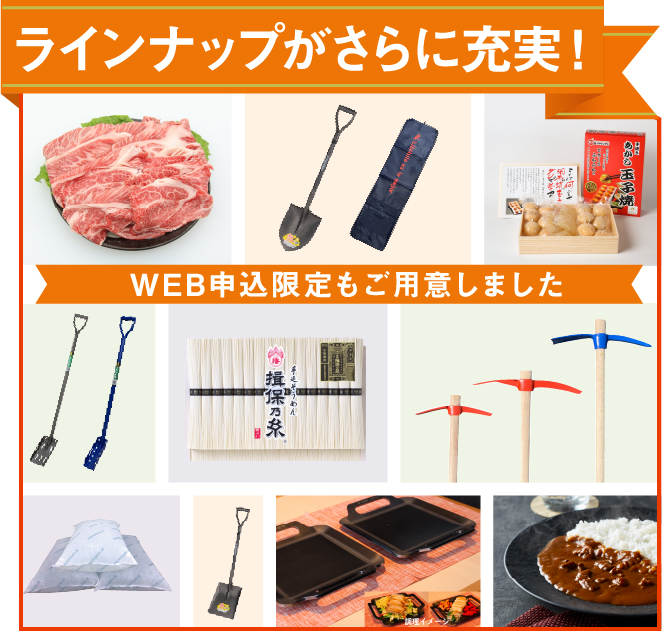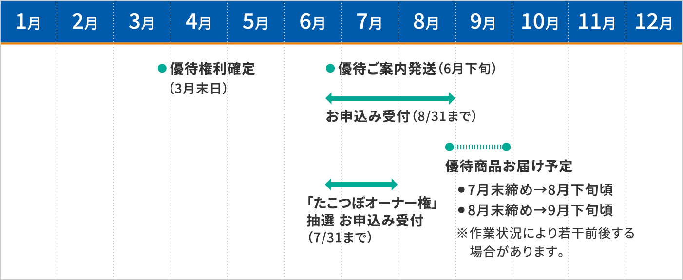 株主のみなさまの日頃のご支援に感謝の気持ちを表すとともに、当社株式への投資の魅力をより一層高め、より多くのみなさまに中長期的に保有していただくことを目的として株主優待制度を導入しています。 MENU ①対象となる株主様 ②ポイント設定(新導入) ③優待内容 500ポイント 1,000ポイント 2,000ポイント 3,000ポイント 4,000ポイント 8,000ポイント WEB申込限定の優待品 ④お申込み方法 ⑤たこつぼオーナー権の抽選申込みについて ⑥優待ご案内時期 ①対象となる株主様※ 2025年3月31日時点で株主名簿に記載または記録された1年以上連続して100株以上を保有している株主様となります。株式を3年以上保有しており、3月末時点で500株以上保有する株主様には長期インセンティブがあります。 対象となる株主様は、株主名簿に記載の株主番号で保有株式数および株式保有期間の判定をいたします。 ご注意 株主番号が変更されると、配布対象から外れてしまいます。以下が株主番号が変わる可能性のある事例です。 株主名簿の登録を変更された場合 相続などにより株式の名義人が変更となった場合 株式をお預けの証券会社を変更された場合 株主名簿の登録から外れた後、再度登録された場合 証券会社の貸株サービスをご利用されている場合 保有株式を全て売却し、基準日までに株式を買い戻した場合 ②ポイント設定(新導入) 100株~499株を1年以上お持ちの株主様は500ポイントから、500株以上を1年以上保有の株主様は保有株式数と保有期間に応じたポイントの範囲から自由にご選択いただけます。 保有株式数 保有期間:1年以上 100~499株 500ポイント 保有株式数 保有期間:1年以上 保有期間:3年以上 500~1,999株 1,000ポイント 2,000ポイント 2,000株以上 4,000ポイント 8,000ポイント ③優待内容 500ポイント QUOカード(500円分) 提携店舗、全国約60,000店のお店でご利用いただけるプリペイドカード 日本赤十字社への寄付(500円) こどもの未来応援基金への寄付(500円) 1,000ポイント QUOカード(1,000円分) 提携店舗、全国約60,000店のお店でご利用いただけるプリペイドカード 日本赤十字社への寄付(1,000円分) こどもの未来応援基金への寄付(1,000円分) 美食庵あきつ食事券(2,000円)江井島の割烹料理店「美食庵あきつ」。地元明石の食材をふんだんに使った料理をお楽しみください。 詳しくはこちら 2,000ポイント サクラミニ丸 スコップ(1本) 従来のショベルよりコンパクトかつ軽量に特化したミニタイプです。刃先を1.2mmにする事で軽量化(950g)に成功しました。 詳しくはこちら 3,000ポイント 軽快ショベル(丸形) + たすけ隊バッグ付き 軽快ショベル(角形) + たすけ隊バッグ付き 柄管をグラスファイバー材にする事で軽量化を実現しました。刃先の厚みを薄くする事でさらなる軽量化を実現しました。手触りが良い木柄ハンドルを採用したショベルと持ち運びに便利なバッグのセットです。 軽快ショベル丸形:詳しくはこちら 軽快ショベル角形:詳しくはこちら たすけ隊バッグ:詳しくはこちら 4,000ポイント BBQ鉄板 極厚6mm Sサイズ(2枚セット) 日工発のキャンプギアブランド「日本鉄具製作」の極厚BBQ鉄板。絶大な蓄熱量で焼きムラなく一気に焼き上げ、極上のキャンプ飯を堪能できます。2~3名用のSサイズは、ご家庭のコンロやカセットコンロでも使いやすい一番人気の鉄板です。 詳しくはこちら 明石夢工房冷凍あかし玉子焼(明石焼き)(3箱セット) 明石産真だこ(明石たこ)のみを使用し、いきいきとした歯ごたえと味わいが楽しめます。ご自宅でいつでも新鮮な本場明石の味を堪能いただけるよう、1玉ずつ丁寧に手焼きで焼き上げています。ふわっトロっな至福の食感をぜひご家庭でお楽しみください。 詳しくはこちら 8,000ポイント ダッシュバッグⅡ(DBW-03)(10 枚入り) 土を使わない緊急災害用土嚢。使用前はコンパクト(0.2kg)ながら、水につけると約2分で15kgに素早く膨張します。 溝クリンセット(溝クリン/溝クリンスリム 2本セット) 溝クリン1200は刃先幅が136mm、溝クリンスリム1000は刃先幅が75mmで狭い側溝清掃作業などに最適です。水分を多くふくんだ側溝作業に便利な水抜き穴付きです。 溝クリン:詳しくはこちら 溝クリンスリム:詳しくはこちら ショベルαミニ65丸 +BBQ鉄板 極厚6mm Sワイドサイズ(2点セット) 掘る・すくう・集める・起こすの4役をこなす、大人気のスコッパーシリーズの軽量版「ショベルαミニ丸」と、「日本鉄具製作」の看板商品である極厚BBQ 鉄板のセット。2~4名用のSワイドサイズの鉄板は、焼きそばやお好み焼きにも大活躍します。 ショベルαミニ65丸:詳しくはこちら BBQ鉄板 極厚6mm Sワイドサイズ:詳しくはこちら BBQ鉄板 極厚6mm Lサイズ + エプロン&アームカバー(3点セット) 「日本鉄具製作」の看板商品である極厚BBQ 鉄板。4~8名用のLサイズはグループ BBQ の主役間違いなし。デニムのロゴ入りエプロンとアームカバーもセットにしました。 ショベルαミニ65丸:詳しくはこちら BBQ鉄板 極厚6mm Lサイズ:詳しくはこちら WEB申込限定の優待品 株主優待サイトからお