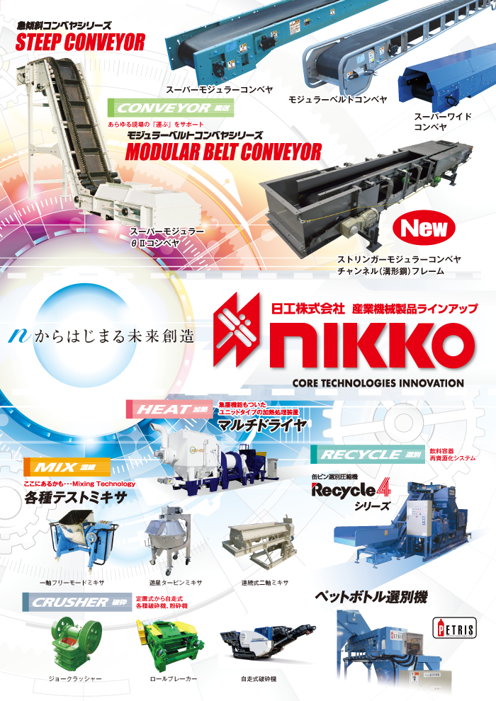 こちらでは、出展製品カタログをダウンロードいただけます。 製品や技術等へのお問い合わせもお受けしています。ページ最下部のフォームからお気軽にお問い合わせください。 出展製品カタログ 飲料容器再資源化システム 飲料容器の回収袋の破袋・搬送・選別・減容までの製品紹介、再資源化システムをご提案 「飲料容器再資源化システム」の動画はこちら 二軸破袋機バッグオープナー 飲料容器回収袋の袋を破袋する破袋機の製品紹介 「飲料容器再資源化システム」の動画はこちら ペットボトル選別機ペトリス 飲料容器ごみからペットボトルを自動選別する装置の製品紹介 「飲料容器再資源化システム」の動画はこちら 缶・ビン選別圧縮機リサイクル4 自動工程でスチール・アルミ缶の選別、圧縮減容をする装置の紹介 「飲料容器再資源化システム」の動画はこちら 計量器付き自動ミキシングユニットNeo 土質改良用のミキサユニット。二軸パドルミキサで高品質の土質改良を実現 「Neo」の動画はこちら モジュラーベルトコンベヤシリーズストリンガーモジュラーコンベヤ チャンネル(溝型鋼)フレーム構造、JIS規格ローラー採用、高強度タイプ 「モジュラーベルトコンベヤ・産業機械製品」の動画はこちら 自走式土質改良機MobixEco 特定盛土等規制法に伴い現場で原料土を効率よく高品質な土質に改良。低燃費型でCO2を削減 「MobixEco」の動画はこちら 自走式破砕機RED RHINO 小型クローラで、一人で破砕現場へ簡単設置。ラインナップも充実 「RED RHINO」の動画はこちら 画像AI認識選別システムアイルビーソーター 画像AI判別による選別。異物・不良品の手選別作業を削減 「アイルビーソーター」の動画はこちら 廃石膏加熱処理システムプラスリアクタ― 石膏粉を加熱脱水し、半水石膏を製造する加熱処理ユニット 「廃石膏ボード リユースプラント」の動画はこちら システム防水板タウンガードシリーズ ~人と街を守る防水板~をモットーにお客様のニーズに合わせた機種をラインナップ その他の関連カタログ 機器総合カタログ 産業機械製品ラインアップ モジュラーベルトコンベヤ総合カタログ 「モジュラーベルトコンベヤ・産業機械製品」の動画はこちら モバイル総合カタログ